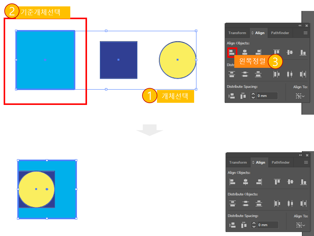 기준 개체를 기준으로 나머지 개체들이 정렬됩니다.