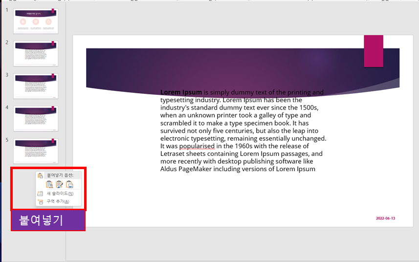 붙여 넣기 원하는 슬라이드에 가서